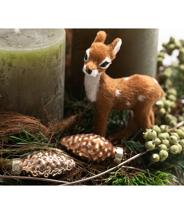 Erst eins, dann zwei, dann drei – die Vorweihnachtszeit steht vor der Tür und Ihnen ist schon jetzt so sehr nach Kerzenschein, gemütlichen Stunden auf dem Sofa oder Plauderstündchen mit Familie und Freunden! Worum Sie sich jetzt am allerliebsten kümmern ist die passende Dekoration, wie sie sich mit einem Adventsgesteck Ebony ganz hervorragend inszenieren lässt. Denn dieses Arrangement ist nicht irgendein Gesteck. Es ist eine absolut trendstarke Kreation, die auf eindrucksvolle Weise zeigt, wie wunderschön sich Kunstmaterialien in Naturtönen zu einem kleinen Schmuckstück kombinieren lassen. Dabei umgarnt eine dicke Kordel im dezenten Naturton die Gruppe aus vier Kerzen und einem herzallerliebsten Rehkitz, während natürliche Zapfen und immergrüne Zweige aus hochwertigem Kunststoff spannende Akzente setzen. Umgeben Sie sich mit einem Adventsgesteck Ebony und zaubern damit vorweihnachtliche Stimmung in Ihr Zuhause.