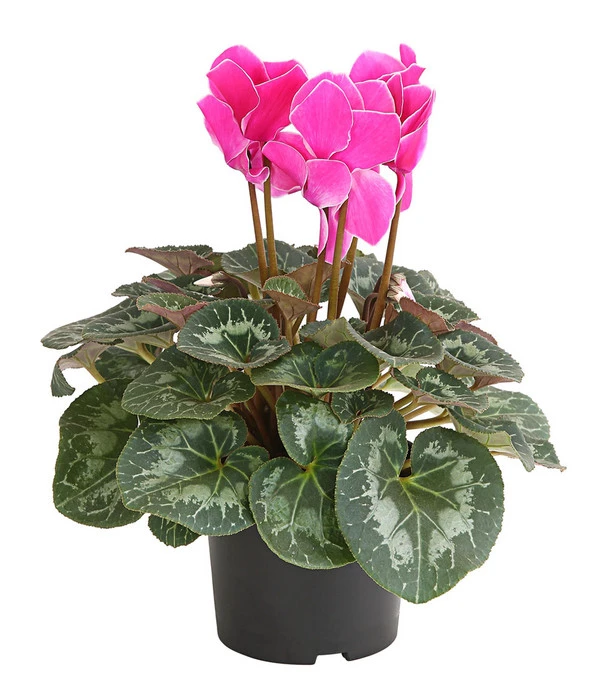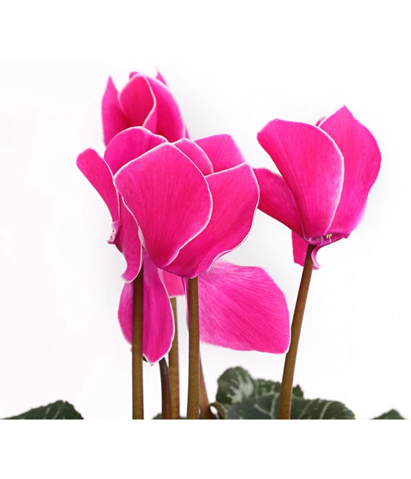 Aus einem kompakten Horst herzförmiger Blätter mit hübscher Zeichnung erheben sich schlanke Stiele, die Blütenköpfe tragen, wie sie schon unsere Urgroßmütter bezaubert haben. Sie leuchten in allen Variationen von strahlendem Weiß über zarte Rosé- bis zu kräftigen Pinktönen, mal größer, mal kleiner, manchmal sogar zweifarbig. Können Sie verstehen, warum diese reizvolle Zimmerpflanze in den letzten Jahrzehnten als altmodisch galt und aus vielen Wohnräumen verbannt wurde? Umso mehr freuen wir uns, dass das Alpenveilchen “wiederentdeckt“ wurde und seit einiger Zeit zur absoluten Modepflanze avanciert. Wenn auch Sie dem nostalgischen Flair der Cyclamen verfallen sind, geben Sie getrost Ihren Gefühlen nach und sichern Sie den Pflanzen gleich einen Logenplatz in Ihrem Zuhause. Bei dieser Sorte hier sind die samtweichen Blütenblätter mit einem feinen, weißen Rand versehen, was den optischen Reiz noch erhöht.