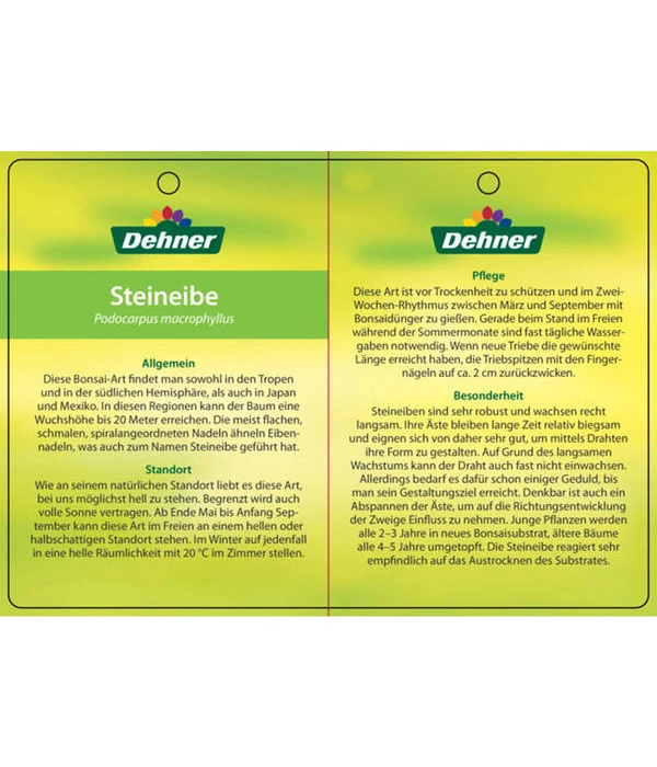 Er passt sich Ihren Lebensgewohnheiten an. Denn den Sommer verbringt der Bonsai Steineibe gerne draußen auf der Terrasse. Sorgen Sie dort für ein halbschattiges Plätzchen und gießen Sie ihn mäßig, um seine Erde stets feucht zu halten. Staunässe sollte vermieden werden. Den Winter verbringt er dann in Ihrer Wohnung an einem hellen Standort. Der Boden sollte nährstoffreich sein, dann gedeiht er gesund und lässt sich wunderbar schneiden und gestalten.