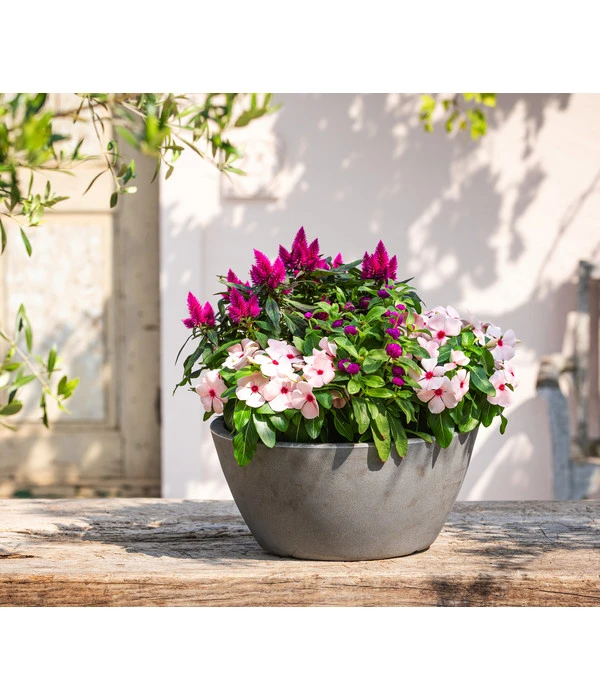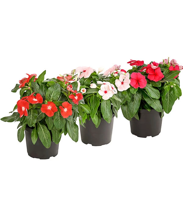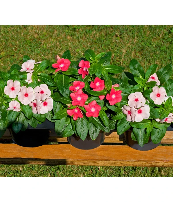 Sie meinen, eine so lange Blütezeit kann nicht sein? Oh doch. Mit der Catharanthe können wir Ihnen eine exotische Schönheit im Beet- und Balkonsortiment mit einem besonders reichen und ausdauernden Blütenflor präsentieren. Die Pflanze ist in den Tropen und Subtropen weit verbreitet, kommt aber ursprünglich aus Madagaskar, weshalb sie auch als Madagaskar-Immergrün bekannt ist. Dort wächst sie als immergrüner Halbstrauch, der bis zu einem Meter Höhe erreichen kann. In unserem Klima wird die Catharanthe nur etwa 30 – 40 cm hoch, eine ideale Größe, um sie als attraktive Balkonkasten- und Kübelpflanze zu kultivieren. Aber die exotische Schönheit trumpft nicht nur mit einem sensationellen Blütenschmuck auf, der weiß, rosa, rot und pinkfarben über dem kräftig grünen Blattwerk leuchtet, sie begeistert auch mit einer schier unglaublichen Robustheit.