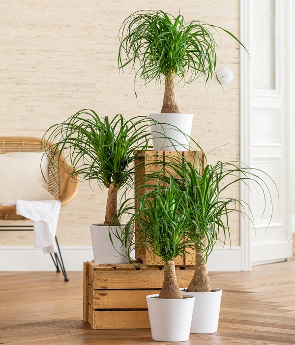 Der Elefantenfuß gehört ohne Zweifel zu den beliebtesten Grünpflanzen in unseren vier Wänden. Kein Wunder – er ist äußert dekorativ und pflegeleicht zugleich. Aus der Spitze des Stammes wächst ein grüner Schopf aus schmalen, gebogenen Blättern, die bis zu einem Meter lang werden können und in seinem knollenförmigen, verdickten Stamm speichert der Elefantenfuß Wasser für lange Durstperioden. Wer sich diesen Stamm näher ansieht, wird sofort erkennen warum die Pflanze den Namen eines Dickhäuters trägt. Nicht nur unter den Namen Elefantenfuß ist diese beliebte Zimmerpflanze bekannt, vielleicht kennen Sie die Beaucarnea auch unter den Namen Flaschen- oder Wasserbaum.