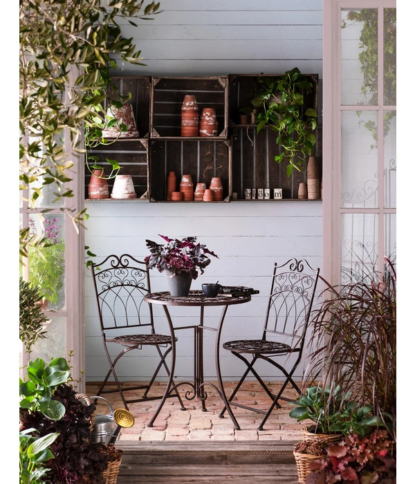Wie wäre es denn, den Metallstuhl Antik als Blumenpodest zu nutzen oder als gestalterisches Element im Ihrem Garten? Dank seiner robusten Verarbeitung in Eisen machen ihm Wind und Wetter nichts aus und die individuelle Patina, die sich nach einiger Zeit im Freien ansetzt, gibt dem Dekostuhl erst sein gewisses Etwas. Und was gibt es Schöneres, als abends mit einem Glas Wein auf der Terrasse zu sitzen und mit Freunden oder der Familie gute Gespräche zu führen? Das Ganze sollten Sie mit der passenden, romantischen Sitzgelegenheit krönen! Platzieren Sie den Metallstuhl Antik im Set beispielsweise um einen handgeschmiedeten Esstisch und lassen Sie sich und Ihre Gäste von dieser malerischen Stimmung verzaubern!